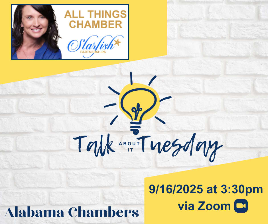 Tune in for a special announcement from our friends at Starfish Partnerships. You can also ask questions about her current programs and hear how other chambers in Alabama that are part of the "All Things Chamber" program. Please also note the time change from our normal time. *MEMBERS PLEASE REGISTER