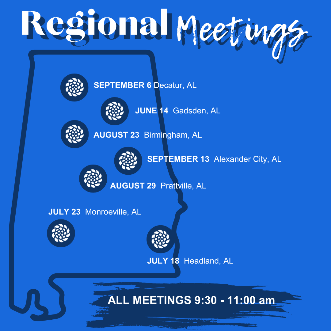 You are invited to join your chamber peers at the Alabama Chambers regional meetings. We will enjoy a roundtable discussion about "What Keeps Us Up at Night?" and share solutions and best practices. Sharing time with others who work in the chamber world is always time well spent! Those who wish to enjoy lunch together will gather at a local restaurant following the meeting. We encourage you to find the location closest to you or with the chambers you are working with on regional efforts. However, you are welcome to join any of the meetings.